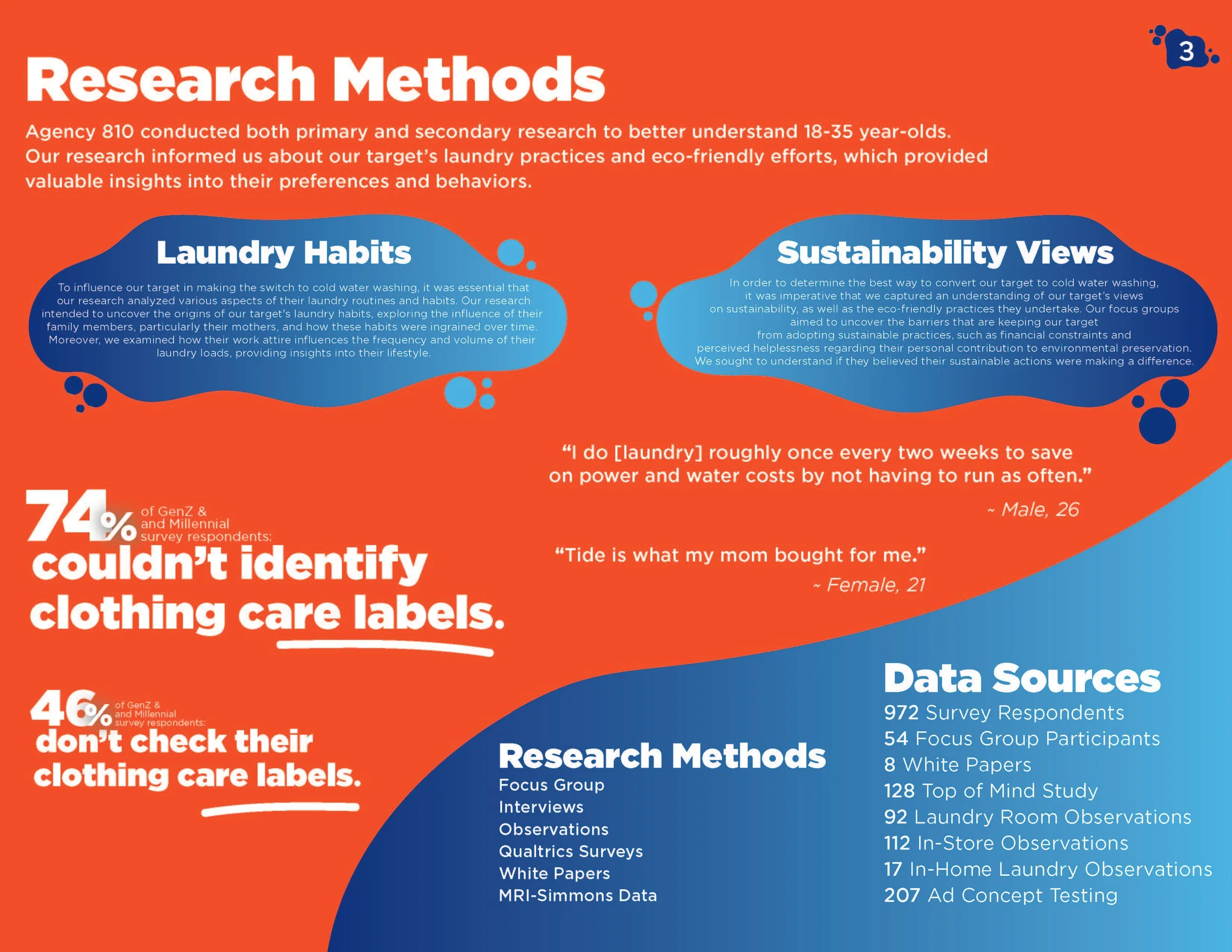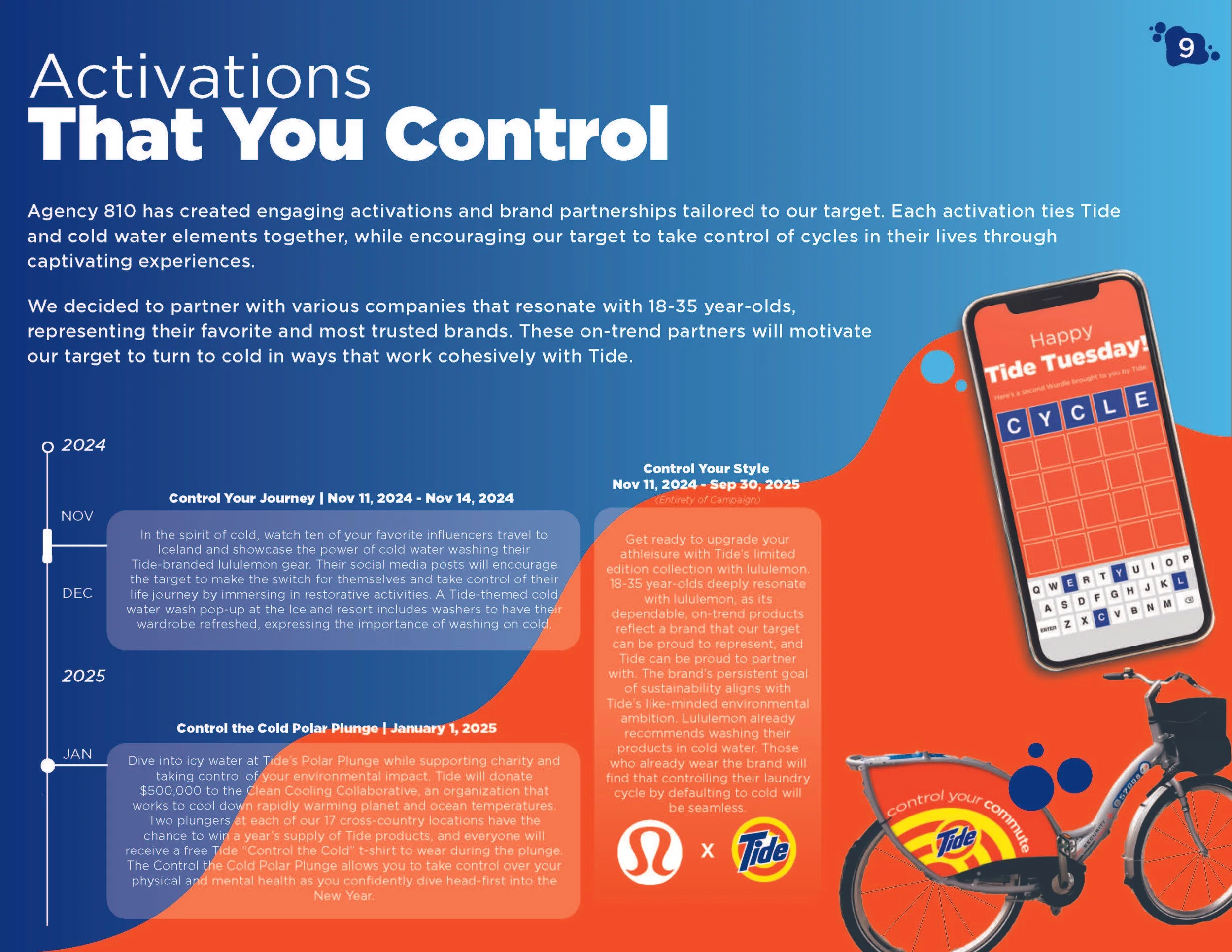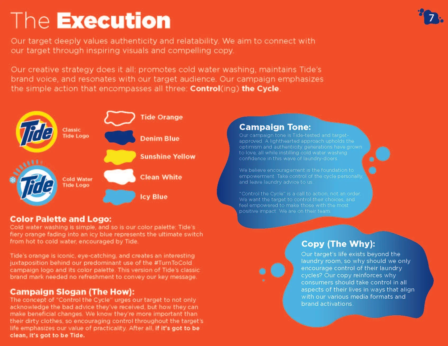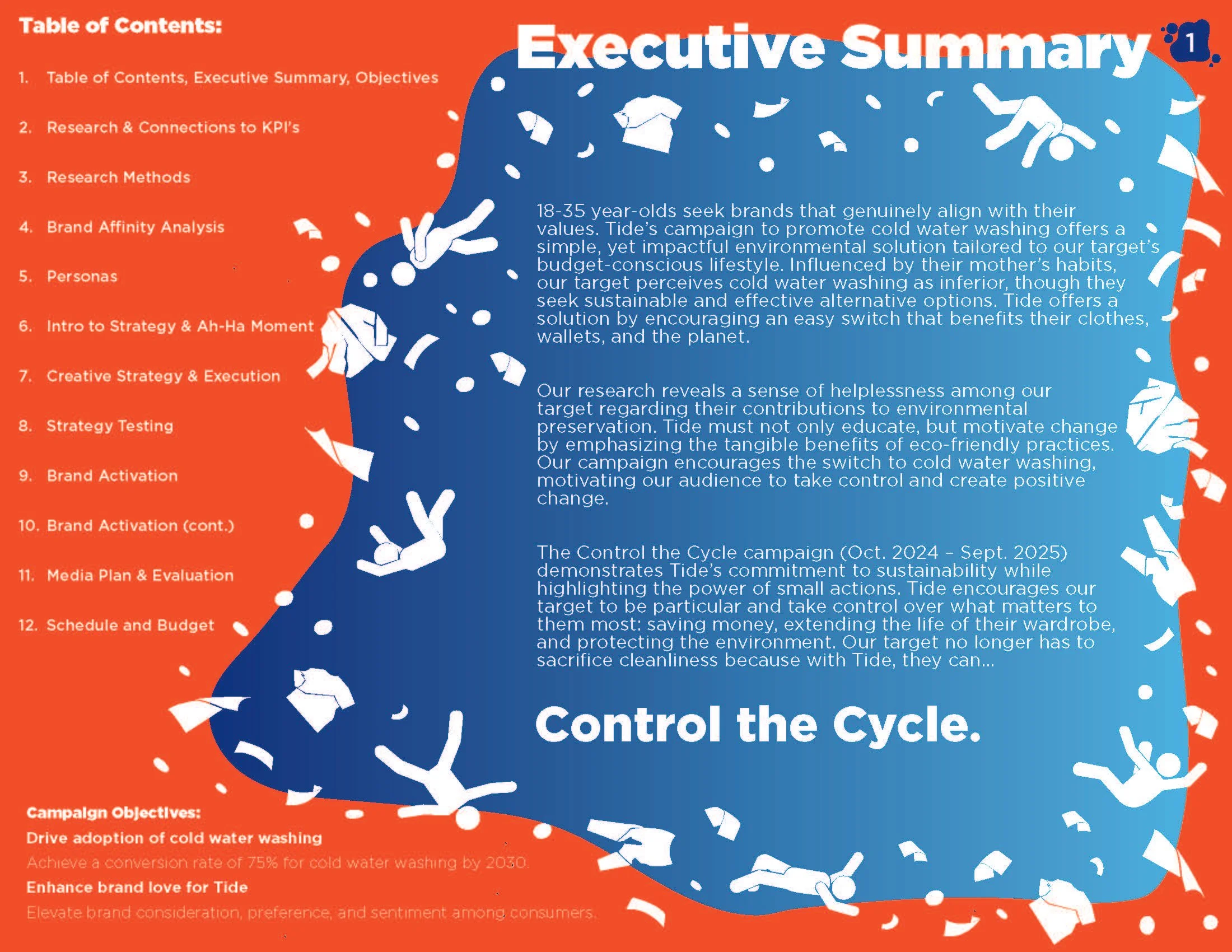 water. Instead, our campaign encourages consumers to control their laundry choices the same way they control other aspects of their lives. We wanted to overcome various barriers with our campaign such as the universal belief that cold water doesn’t clean as well as hot water, as well the lack of awareness about the benefits of cold water washing. Our campaign achieved these objectives, winning our team 1st place in the District 1 Competition of the National Student Advertising Competition (NSAC).